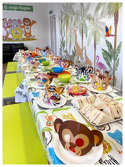 Situated upstairs away from the play area, our colourful party room is the perfect place to calm down after rushing around the soft play and enjoy the party buffet and cake with all the birthday child’s friends.