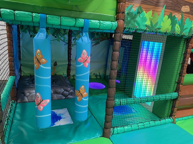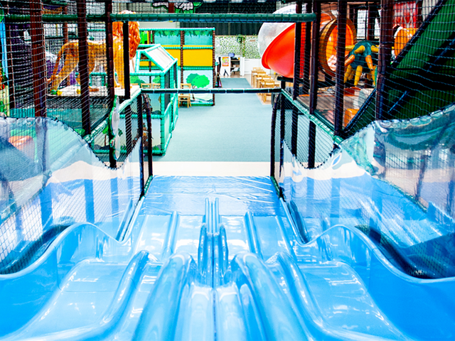 There is so much to discover over 3 levels, hidden volcanoes, rope & ball swing, rainbow slides, curly slides, spider web & a walk of fear for those brave enough. Climbing, crawling, ducking, squeezing & sliding.