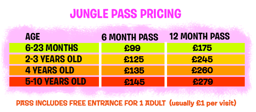 The Jungle Pass also works as a Jungle (loyalty) Card so you can collect points (5p per £1 spent) on everything at Jungle Kingdom. Upon expiry of your JUNGLE PASS, should you not wish to renew, it will be replaced with our JUNGLE (loyalty) card – so you can still use all points collected and keep on collecting. You can collect points (5p per £1 spent) on all items paid for: passes, entrance, Explorers’ café, parties, socks, exclusive hire etc.